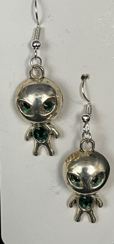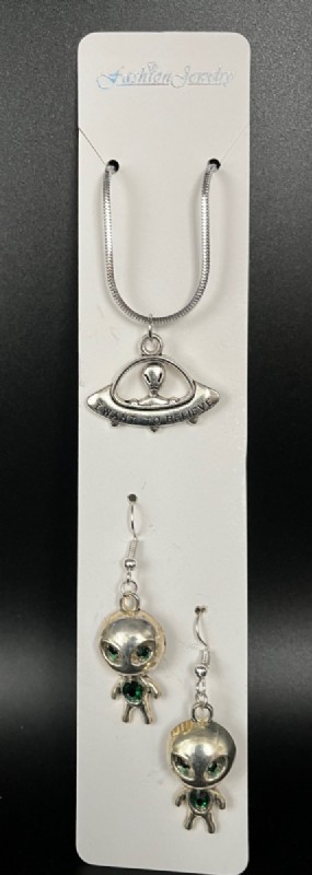 Turn heads and spark conversations with this bold, extraterrestrial-inspired jewelry set. Featuring a sleek silver-toned finish and striking Green gemstone accents, each piece showcases a stylized alien head design that blends sci-fi whimsy with modern edge.